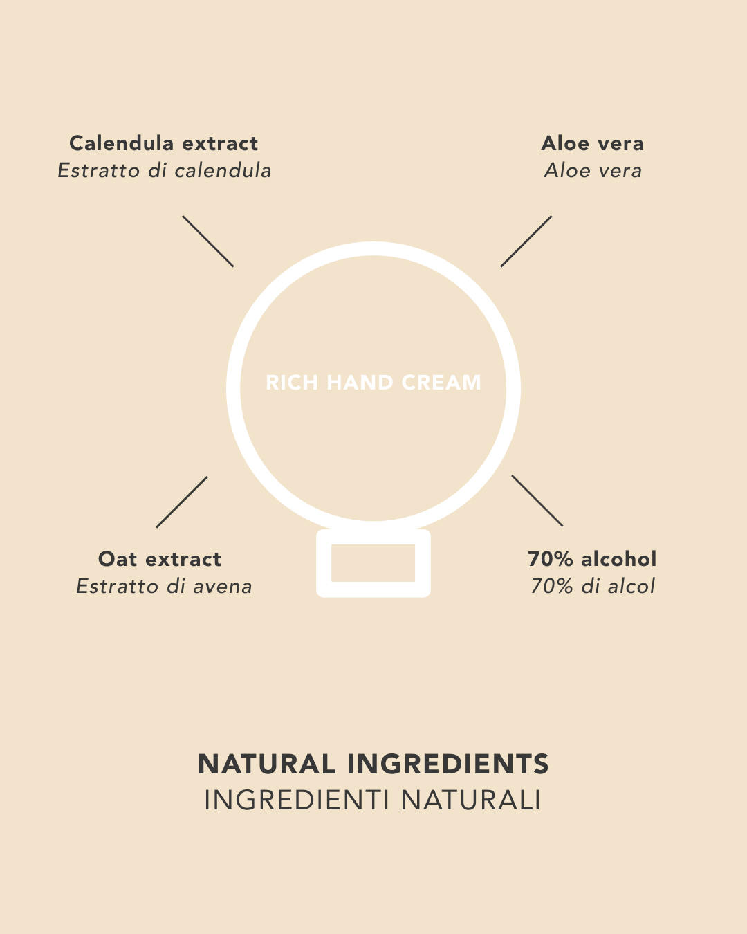 Rich Hand Cream es una crema de manos que repara y nutre profundamente la piel dejándola suave e hidratada. Su fórmula también incluye un alto porcentaje de alcohol (70%) que ayuda a mantener las manos limpias y protegidas.