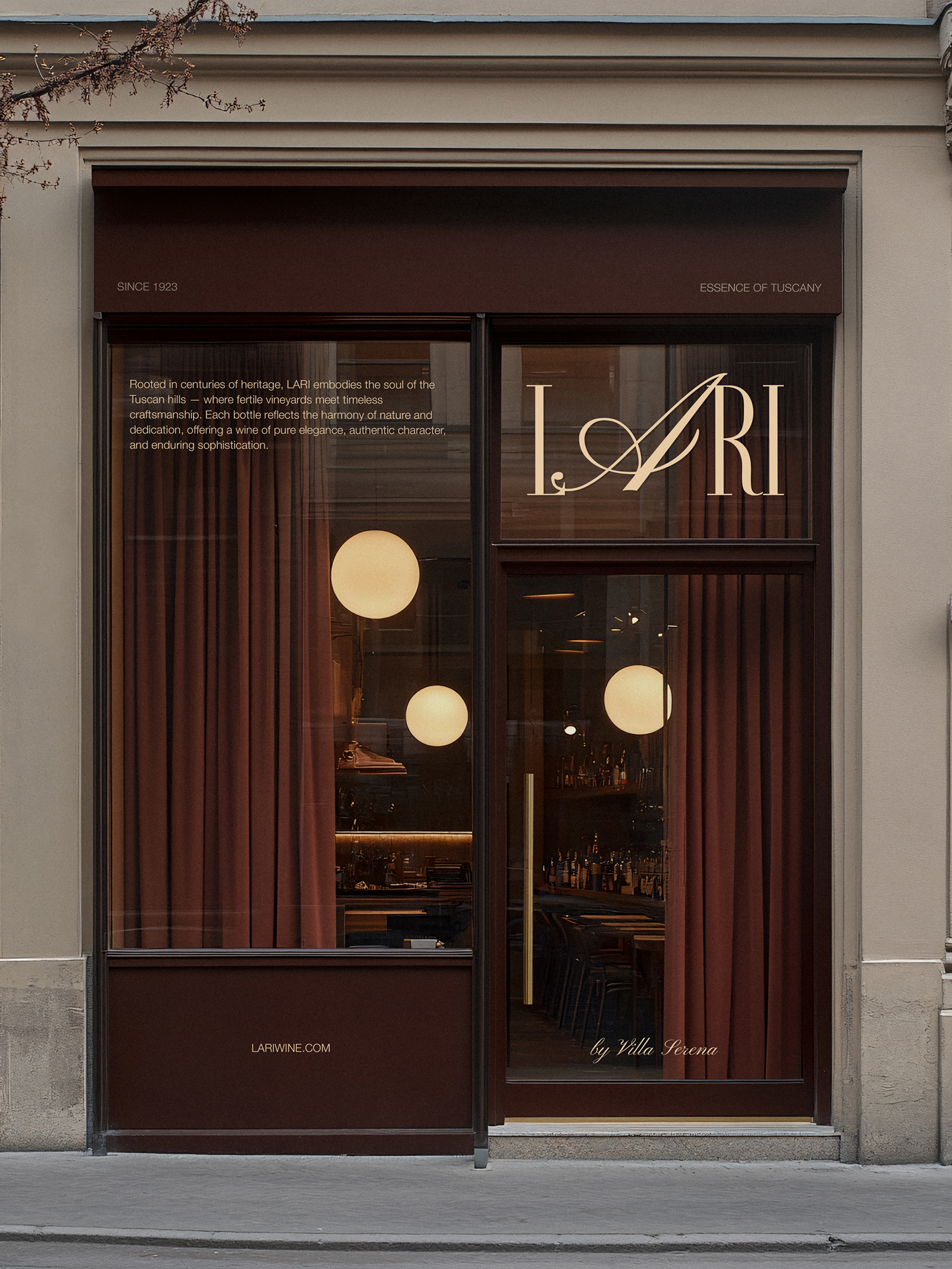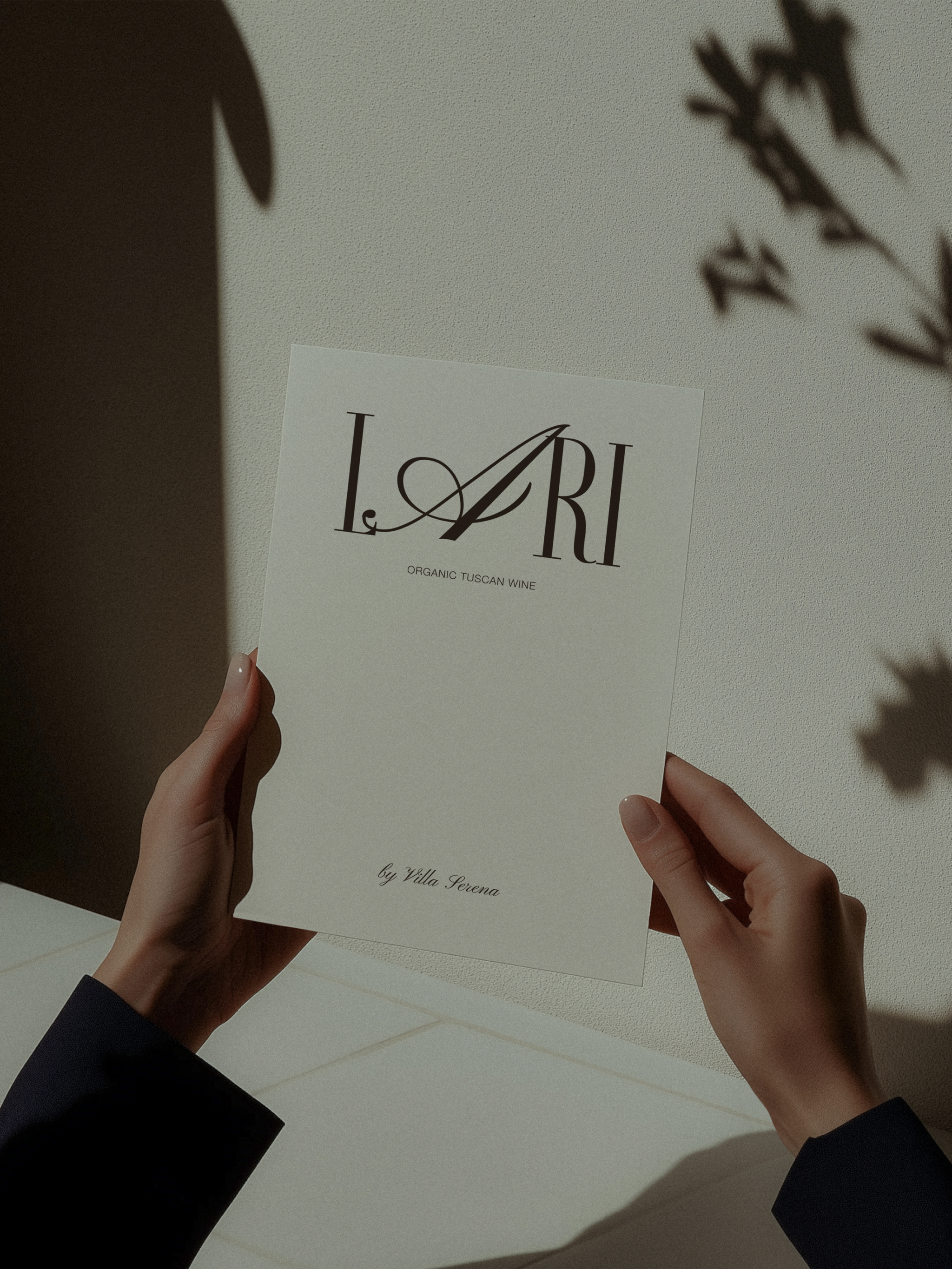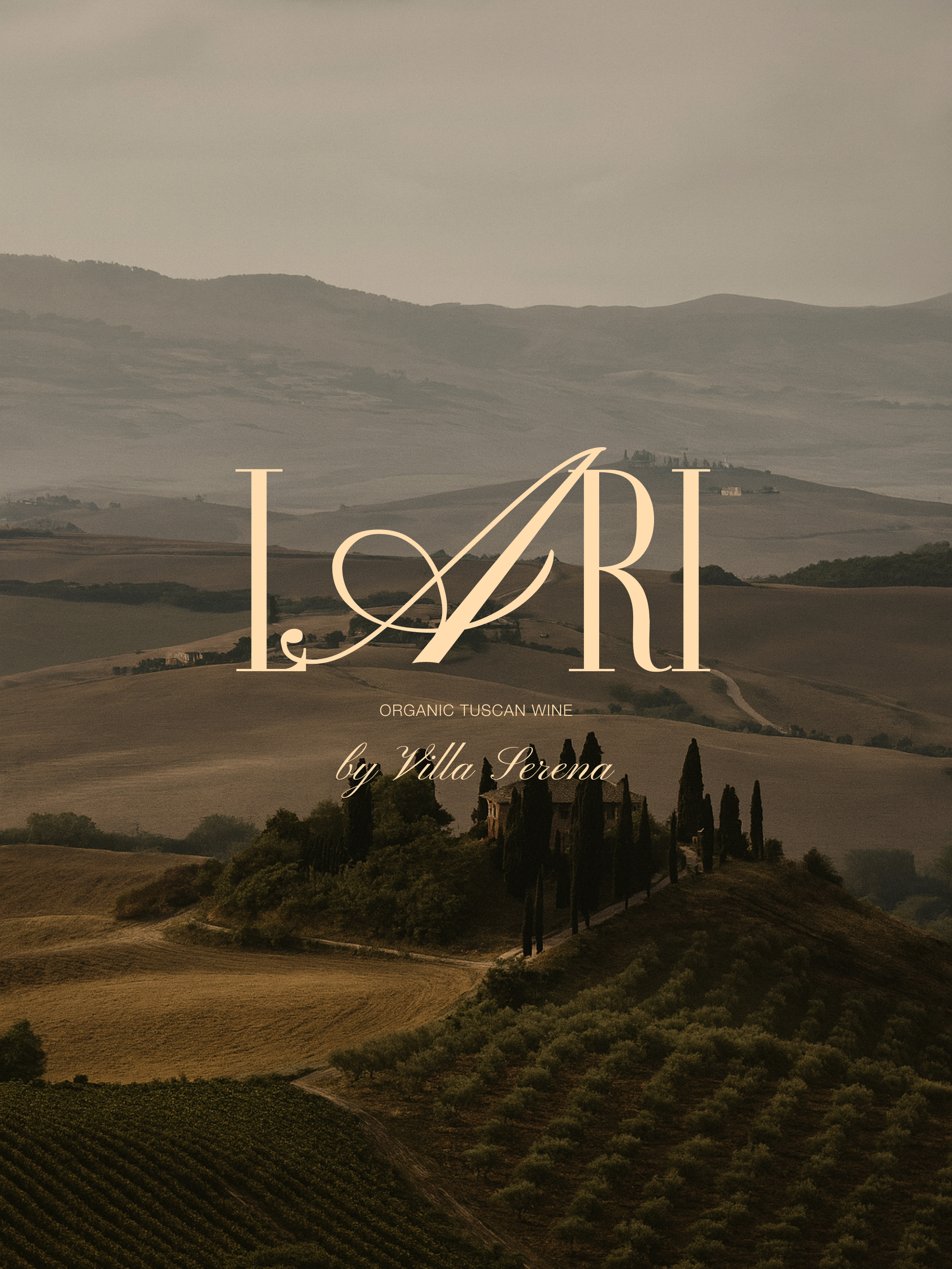 La identidad de LARI se inspira en el carácter atemporal de la Toscana: tonos cálidos que recuerdan la tierra y la piedra, tipografías con un aire clásico pero refinado, y un diseño sobrio que combina tradición y sofisticación contemporánea. La marca busca transmitir una sensación de lujo orgánico, donde la herencia vinícola se une con valores actuales de sostenibilidad y elegancia discreta.